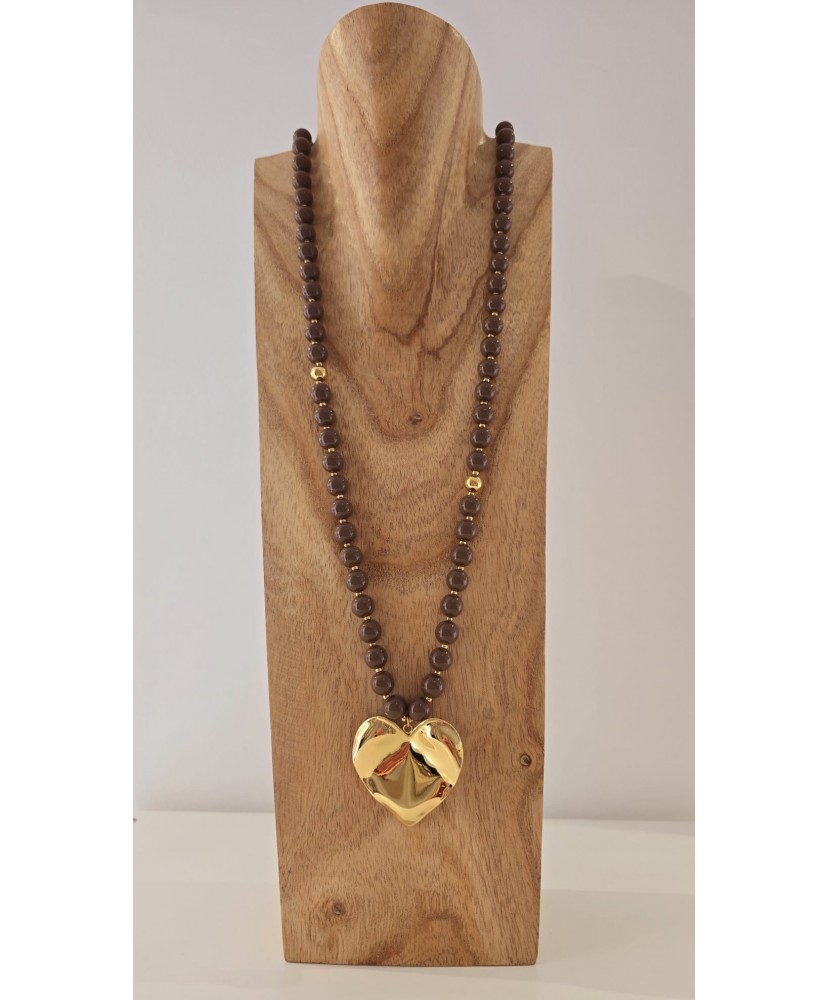 Sautoir Acier Chocolat - Pendentif Cœur Doré