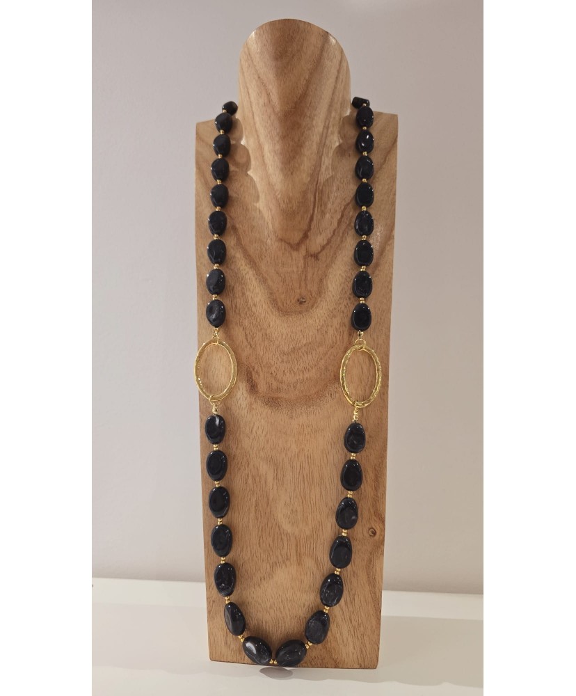 Sautoir Acier Perles Bleu Nuit - Anneaux Dorés