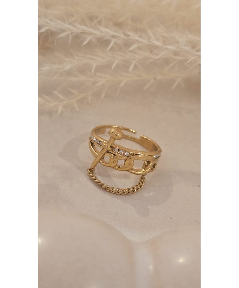 La bague Chain & Strass combine une chaîne stylisée, un motif clou tendance et une ligne de strass scintillants. Une pièce originale qui apporte un côté rock-chic à toutes vos tenues.