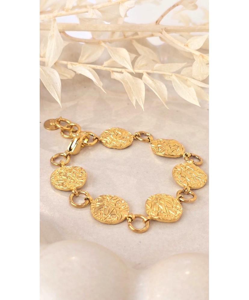 Lumineux et sophistiqué, le bracelet Soleil Martelé séduit par son enchaînement de médaillons dorés à la texture martelée, qui captent la lumière avec intensité. Chaque disque apporte du relief et du caractère, créant un bijou à la fois fort et élégant.