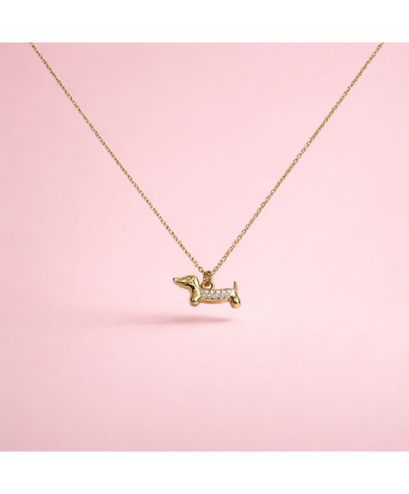 Ce collier met en scène un adorable pendentif en forme de petit chien, délicatement orné de strass pour une brillance subtile.
