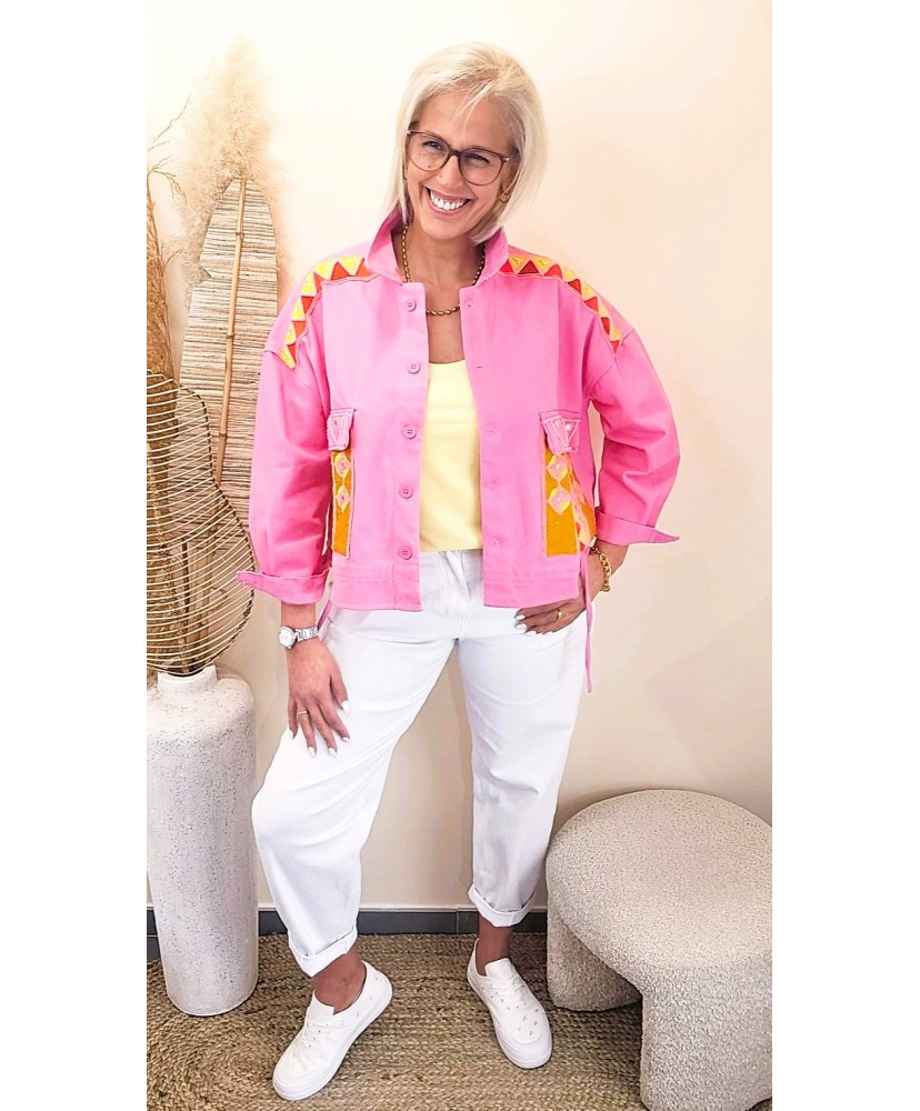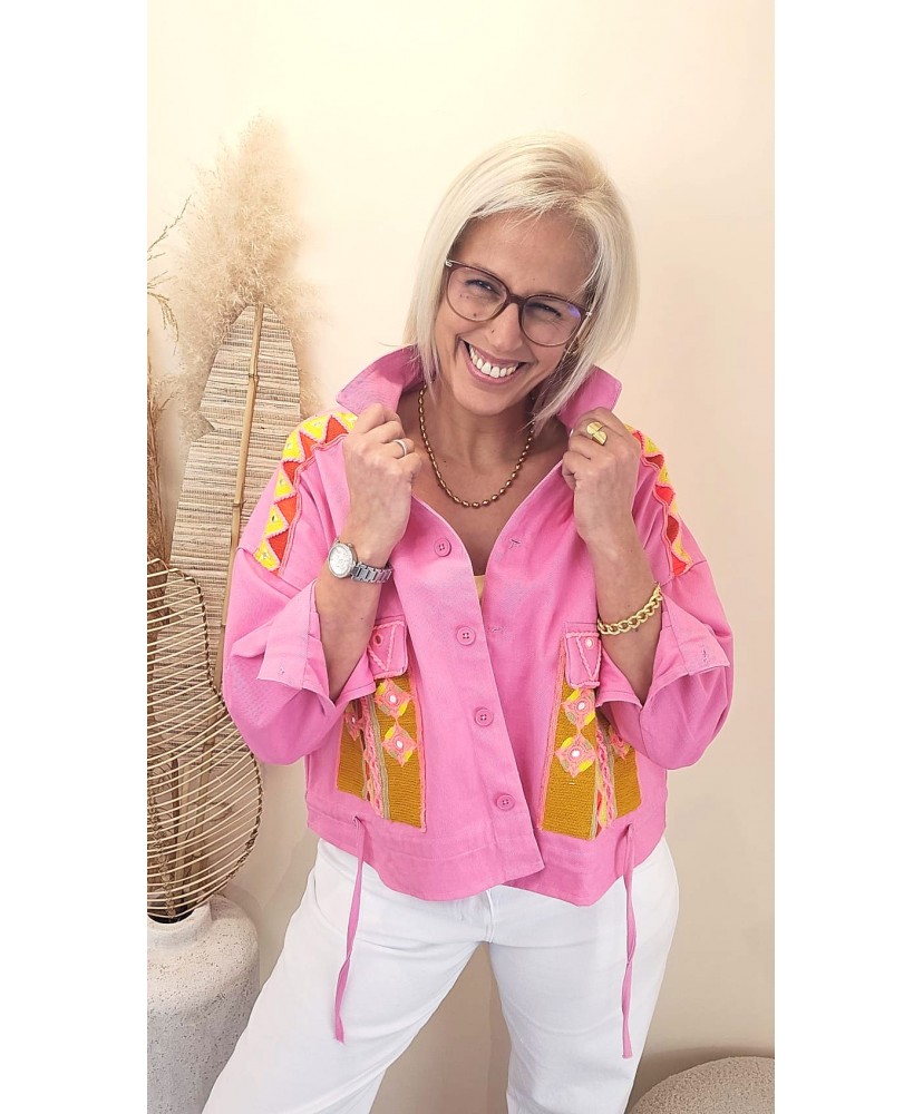 Avec son rose vibrant et ses magnifiques broderies aux tons chauds sur les épaules et les poches, elle donne instantanément une allure tendance et lumineuse.