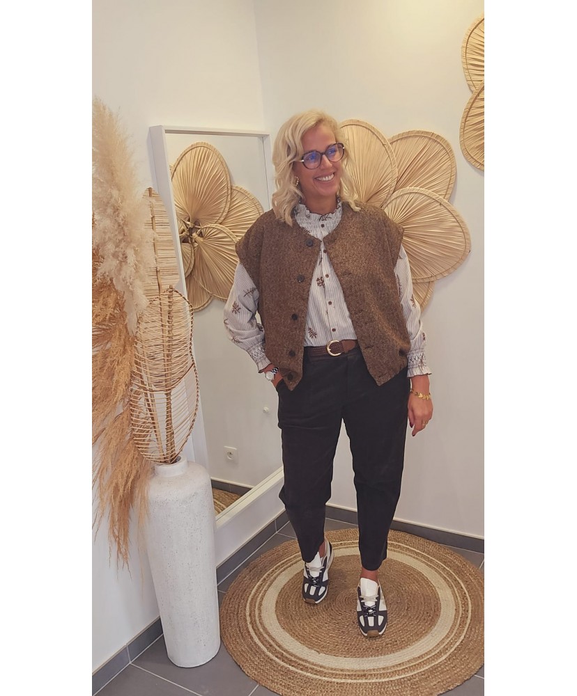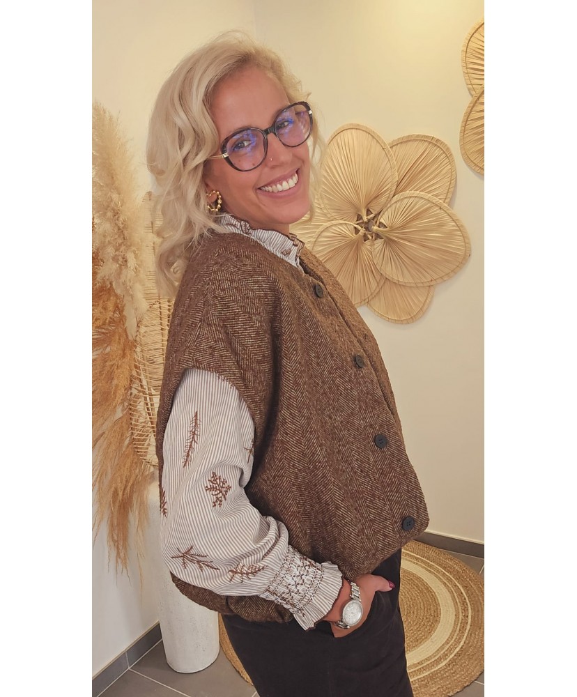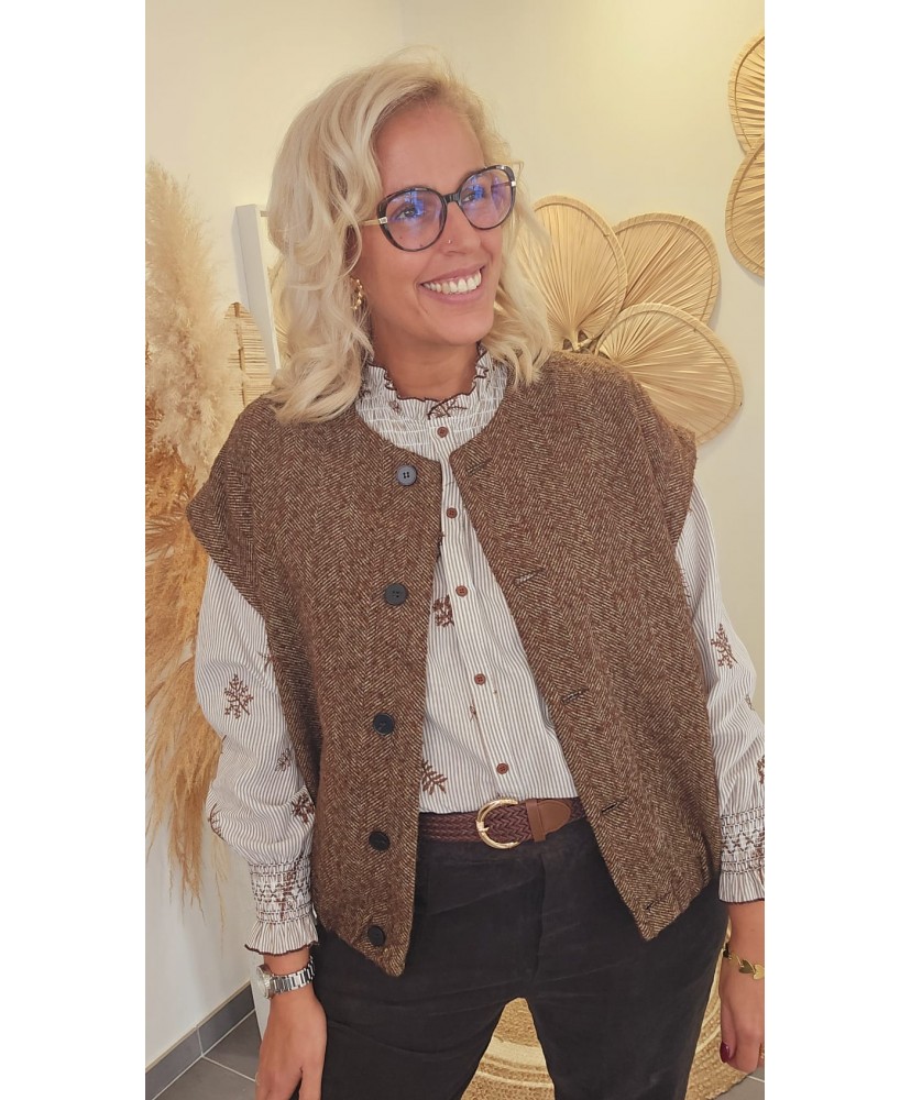 Apportez une touche de style rustique et élégant à vos tenues avec cette veste sans manches en laine. Son motif chevrons intemporel et sa teinte marron chaud en font une pièce incontournable pour la mi-saison.
