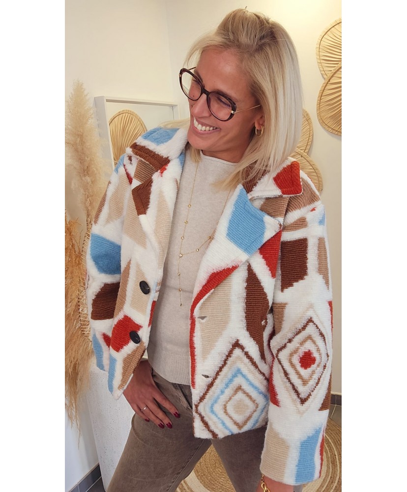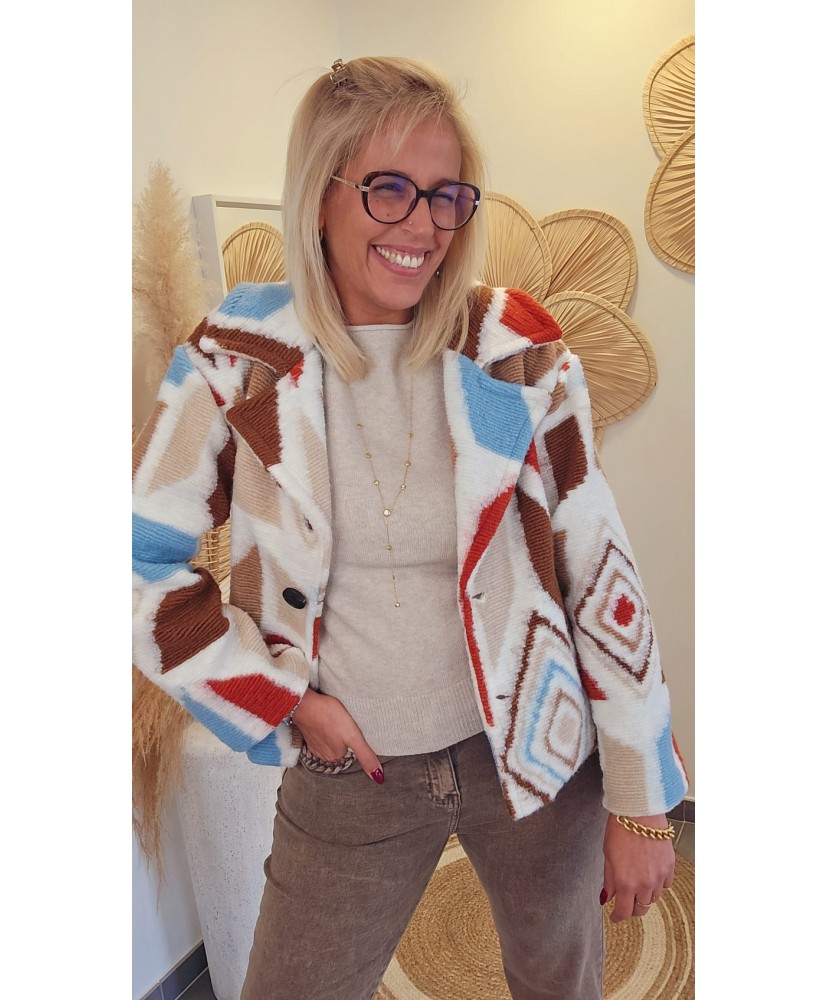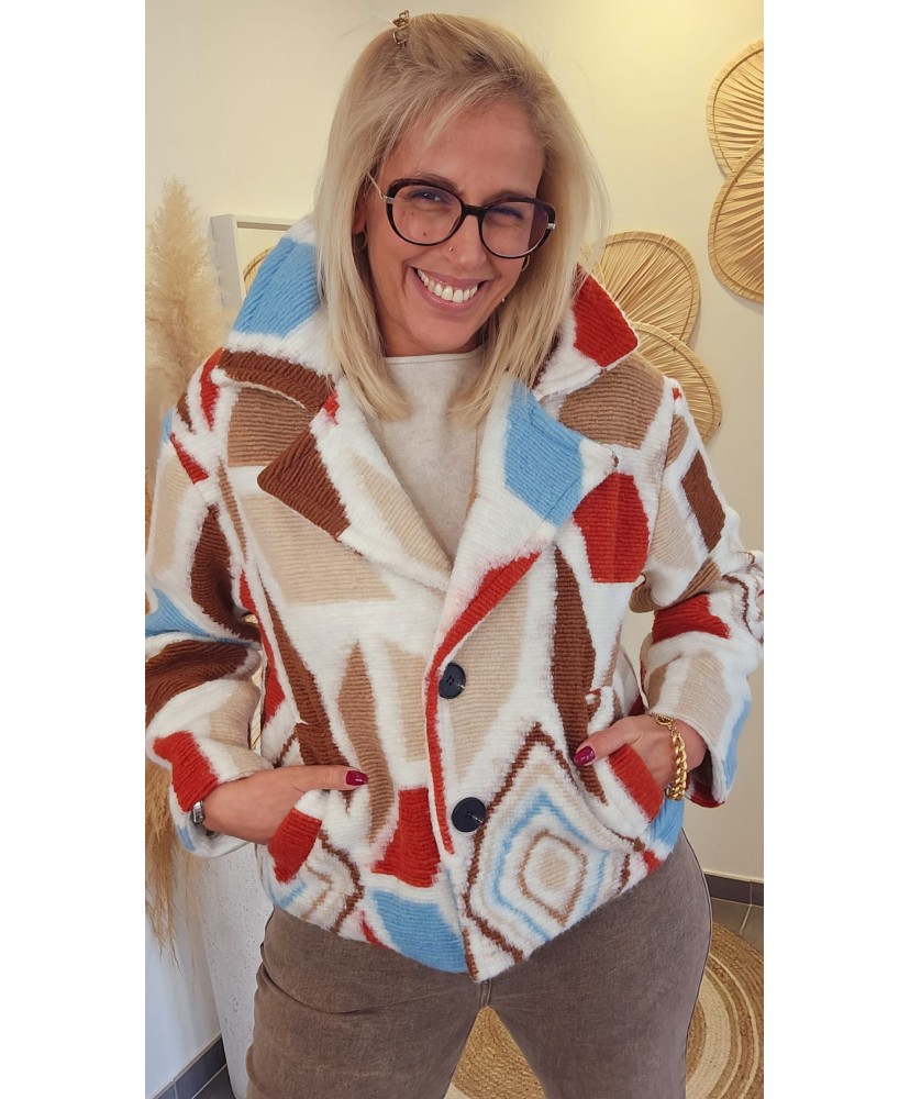 Apportez du peps à votre look avec cette veste courte à motifs géométriques ultra-tendance ! Son mélange de couleurs chaudes et lumineuses – beige, marron, bleu ciel et rouge brique – en fait une pièce forte et pleine de caractère.