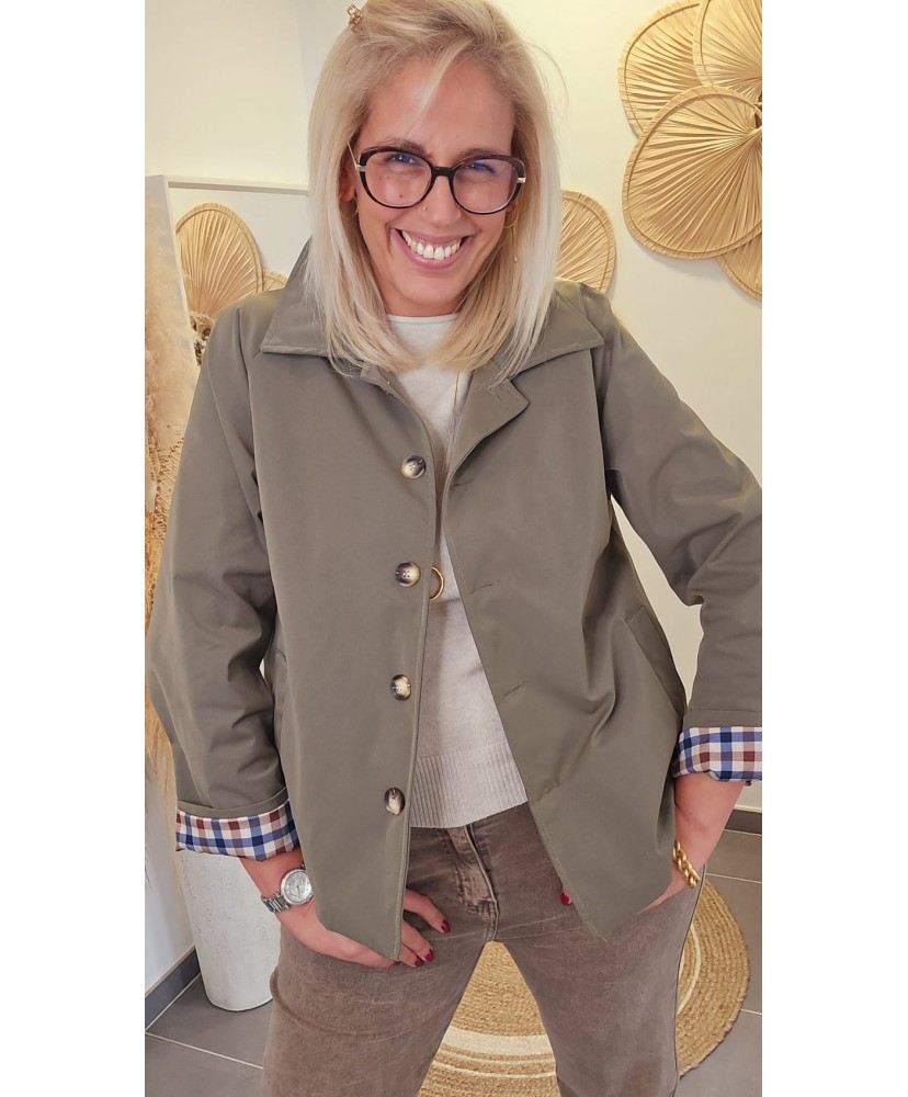 Cette veste courte kaki est la pièce parfaite pour un look chic et décontracté. Sa coupe droite et fluide met en valeur la silhouette tout en assurant un confort optimal. Les revers de manches à imprimé carreaux apportent une touche d’originalité et de style, idéale pour la mi-saison.