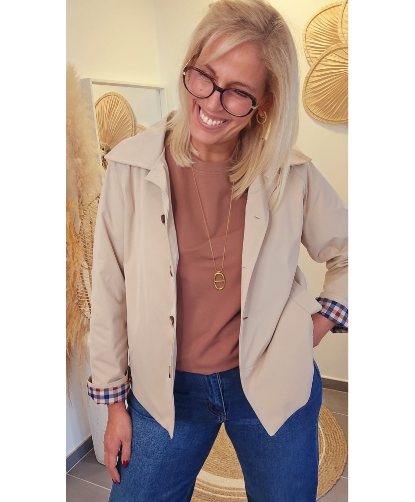 Cette veste courte beige est la pièce parfaite pour un look chic et décontracté. Sa coupe droite et fluide met en valeur la silhouette tout en assurant un confort optimal. Les revers de manches à imprimé carreaux apportent une touche d’originalité et de style, idéale pour la mi-saison.