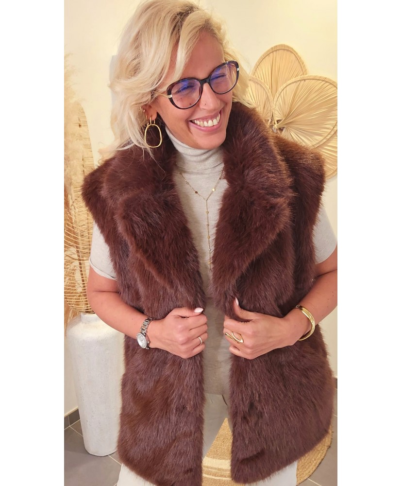 Gilet Chocolat Sans Manches Fausse Fourrure - Melina