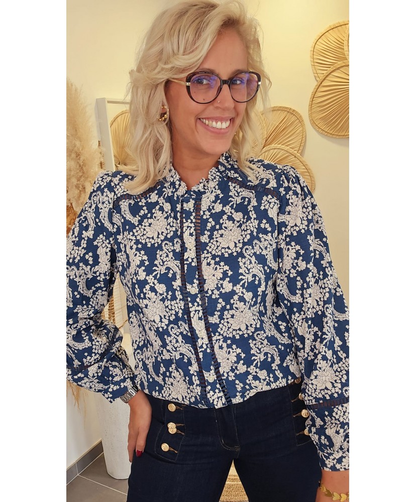 Son imprimé floral ivoire sur fond bleu profond apporte une touche féminine et raffinée, tandis que ses détails ajourés discrets le long de la patte de boutonnage et des épaules ajoutent une note délicate.