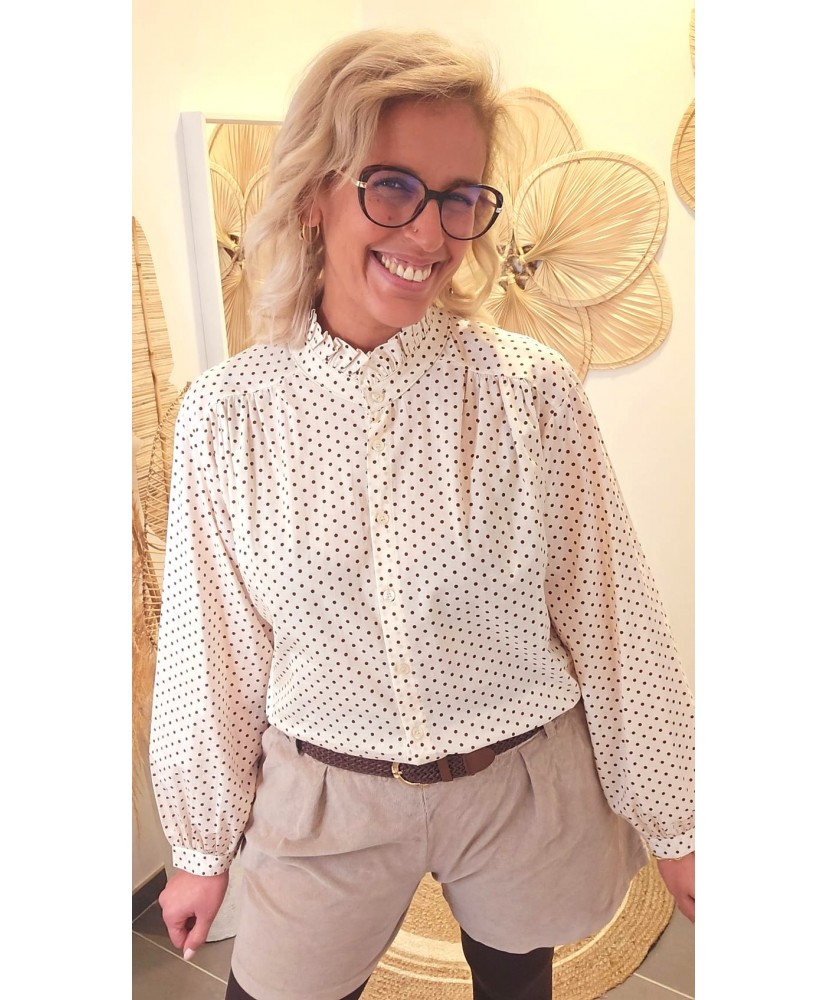 Craquez pour cette superbe chemise écrue à petits pois, une pièce pleine de charme qui apporte une touche rétro chic à toutes vos tenues.