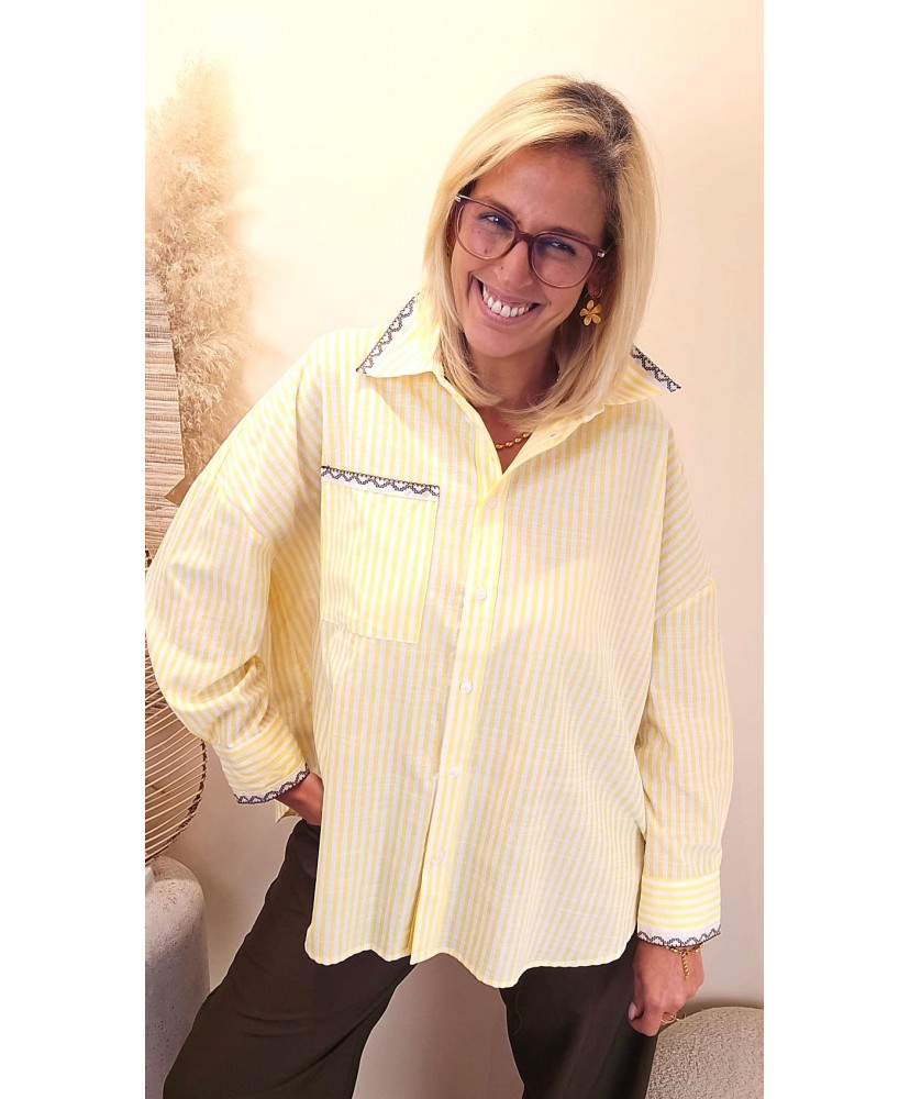 Cette chemise rayée jaune séduit par son allure douce et féminine, sublimée par de délicates broderies couleur chocolat qui font toute son originalité.