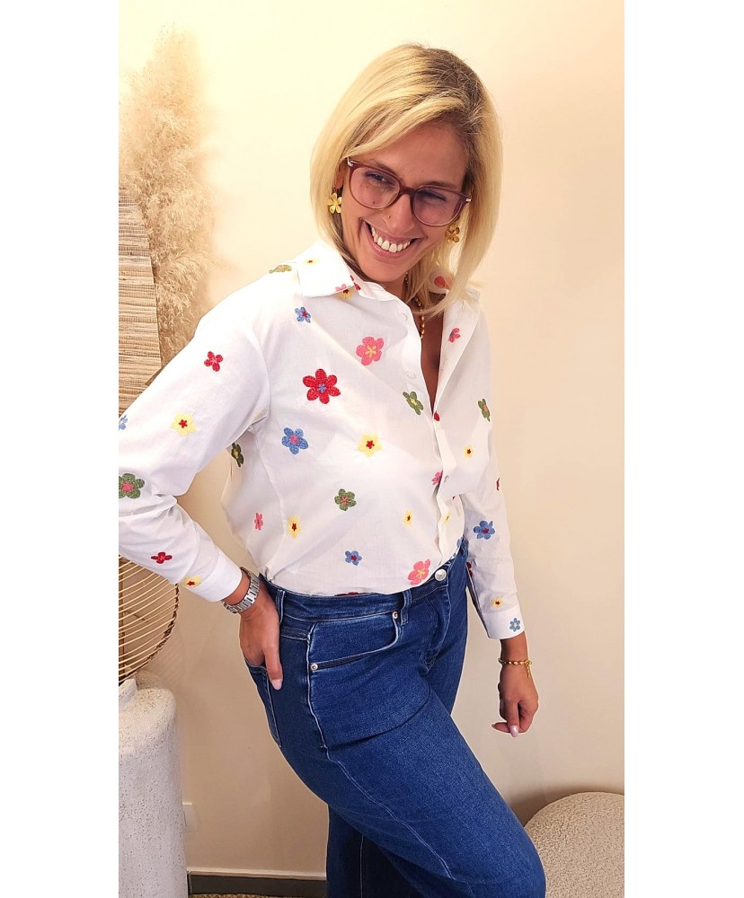 Cette chemise blanche séduit immédiatement par ses broderies florales délicates, subtilement réparties sur l’ensemble du tissu. Chaque petite fleur apporte une touche de couleur et de fraîcheur, pour un look à la fois chic et joyeux.