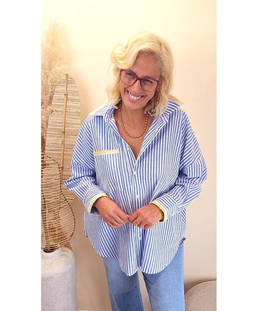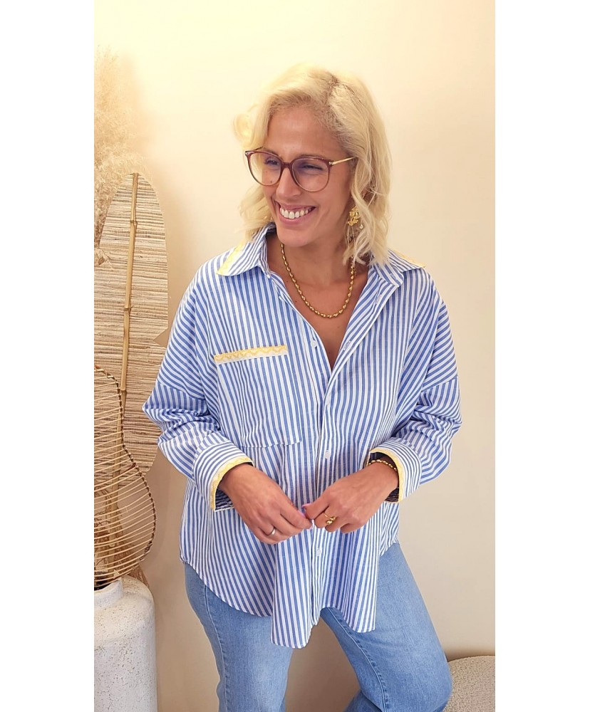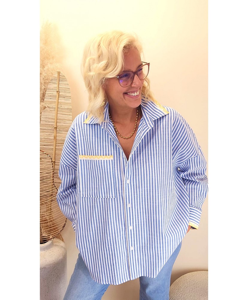 Cette chemise rayée bleu séduit par son allure douce et féminine, sublimée par de délicates broderies couleur jaune qui font toute son originalité.