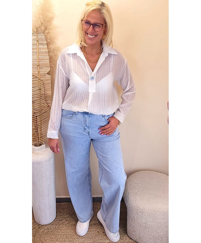 La Chemise Pure Élégance se porte aussi bien avec un jeans clair, un pantalon habillé ou une jupe, pour créer une tenue fraîche, chic et facile à porter au quotidien.