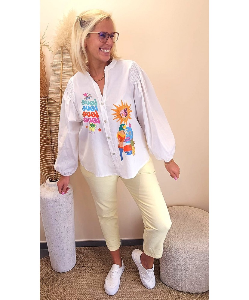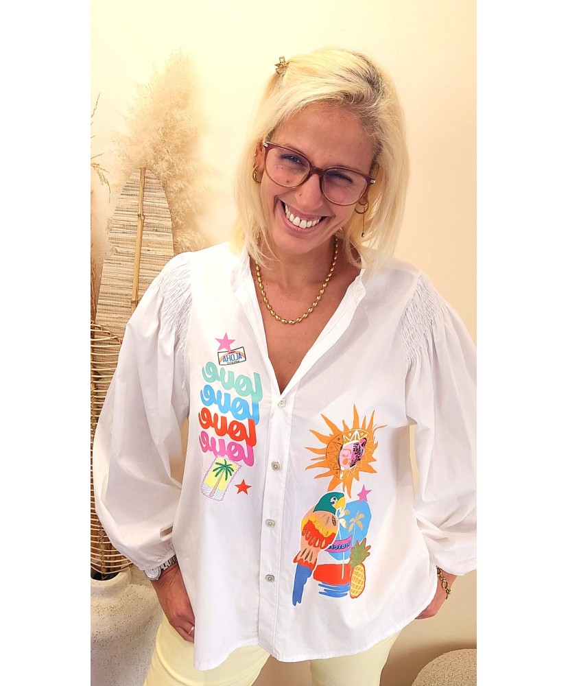 Confectionnée dans une matière légère et agréable à porter, cette blouse blanche se distingue par ses motifs colorés inspirés de l’univers tropical : soleil, perroquet, palmier et inscriptions fun qui donnent immédiatement un esprit vacances et estival.