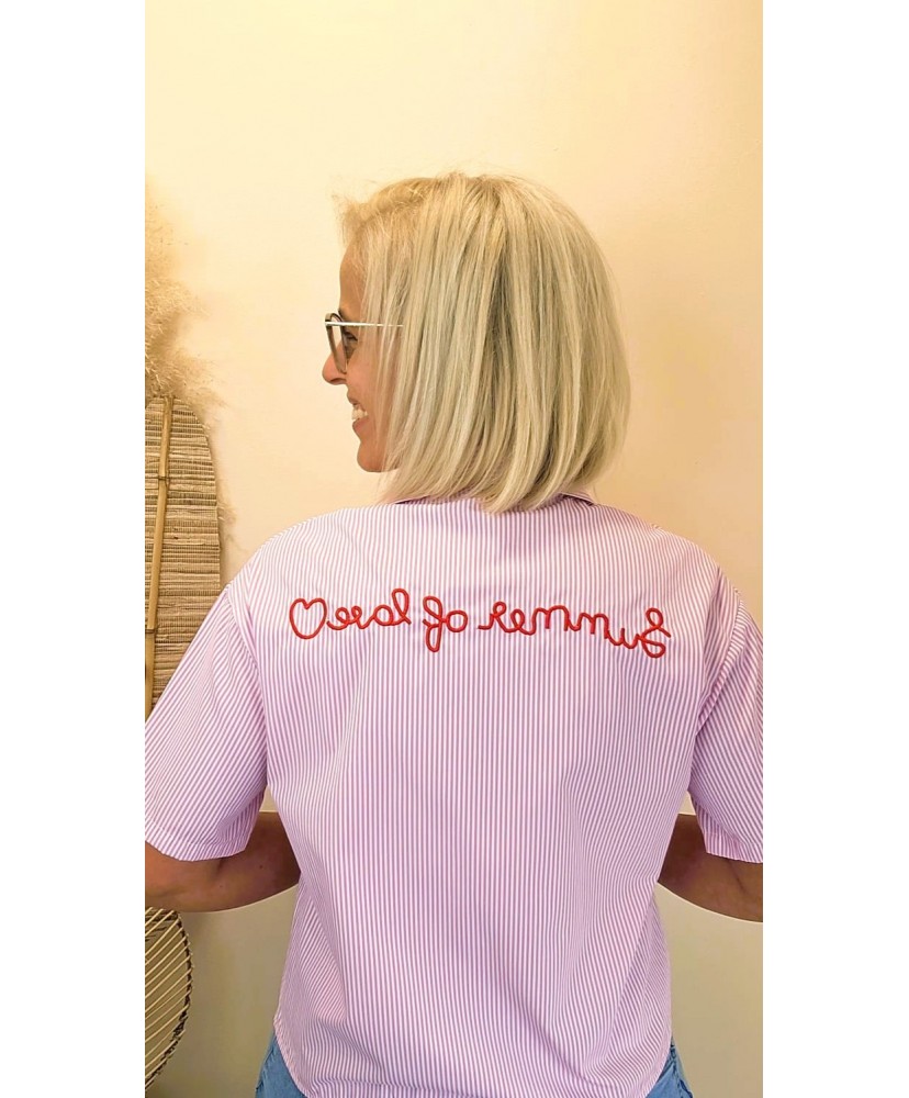 La Chemise "Summer of Love" séduit par ses fines rayures délicates et surtout par son message brodé dans le dos qui apporte une touche unique et pleine de caractère.