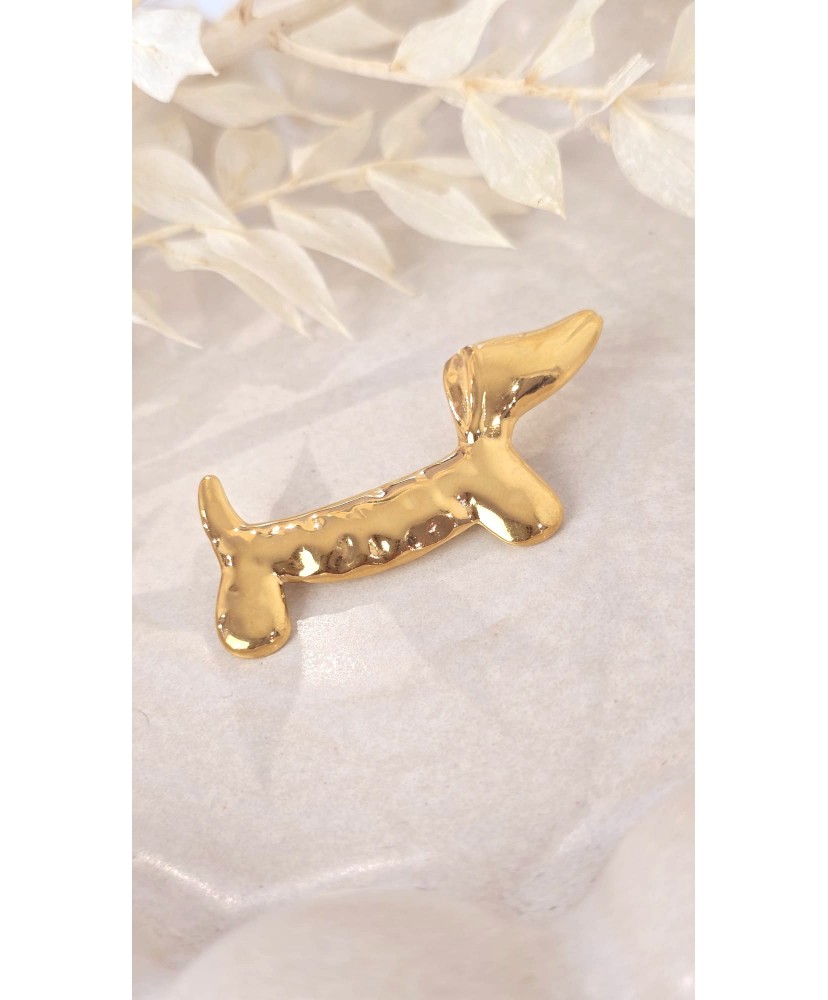 La broche Teckel Chic séduit par son design original et sa finition dorée brillante. Inspirée du célèbre petit chien au corps allongé, elle apporte une note à la fois ludique, élégante et pleine de personnalité à vos tenues.