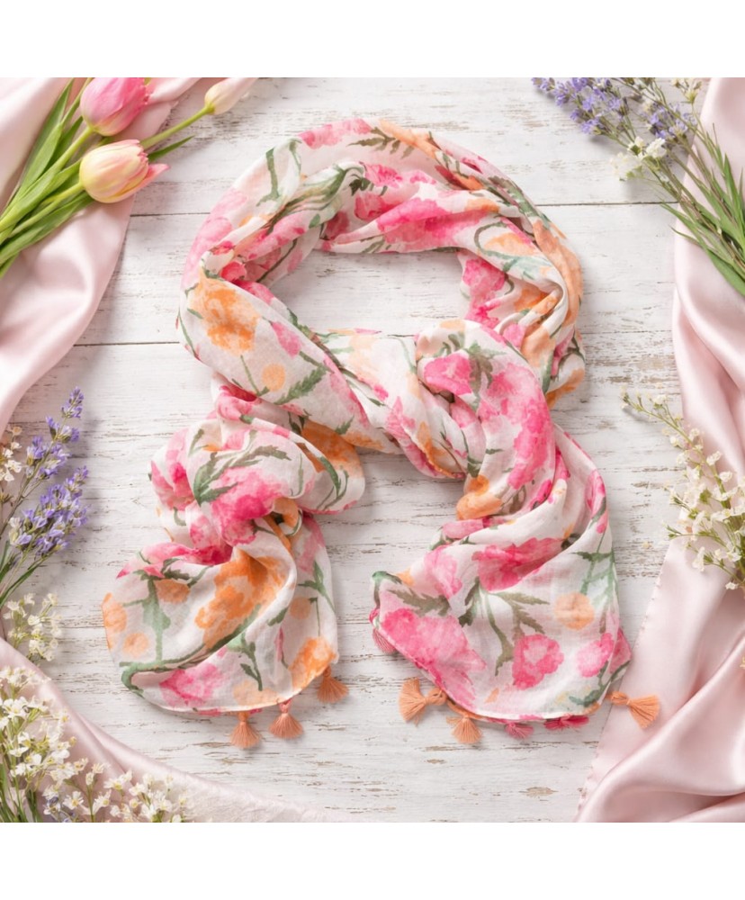 Un foulard délicat aux imprimés floraux aux tons rose et pêche, sublimé par de jolis pompons pour une touche bohème chic 💐