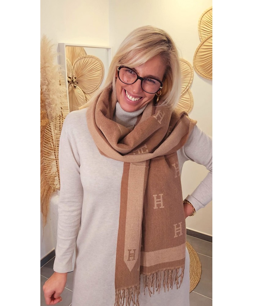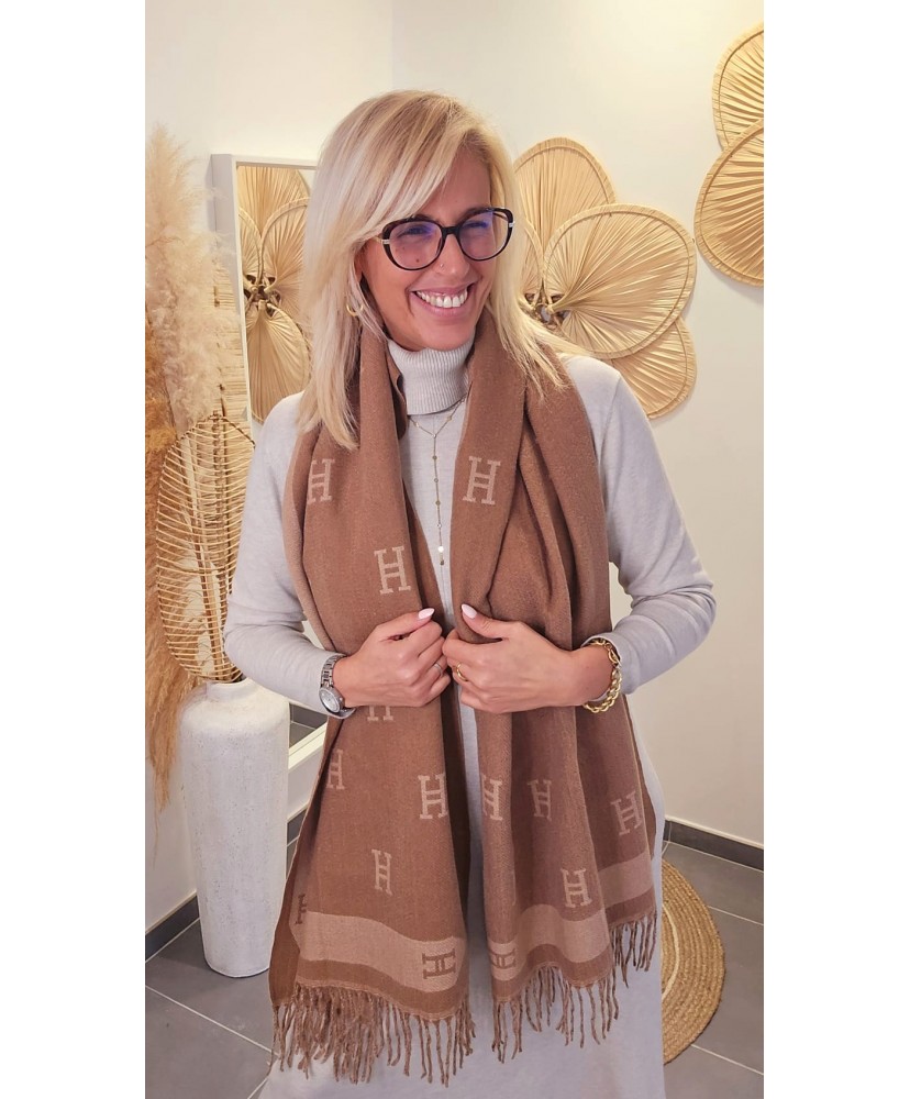 Cette superbe écharpe camel se distingue par son tissage ultra-doux et son élégant motif H en all-over, pour une touche tendance et raffinée à chaque look.