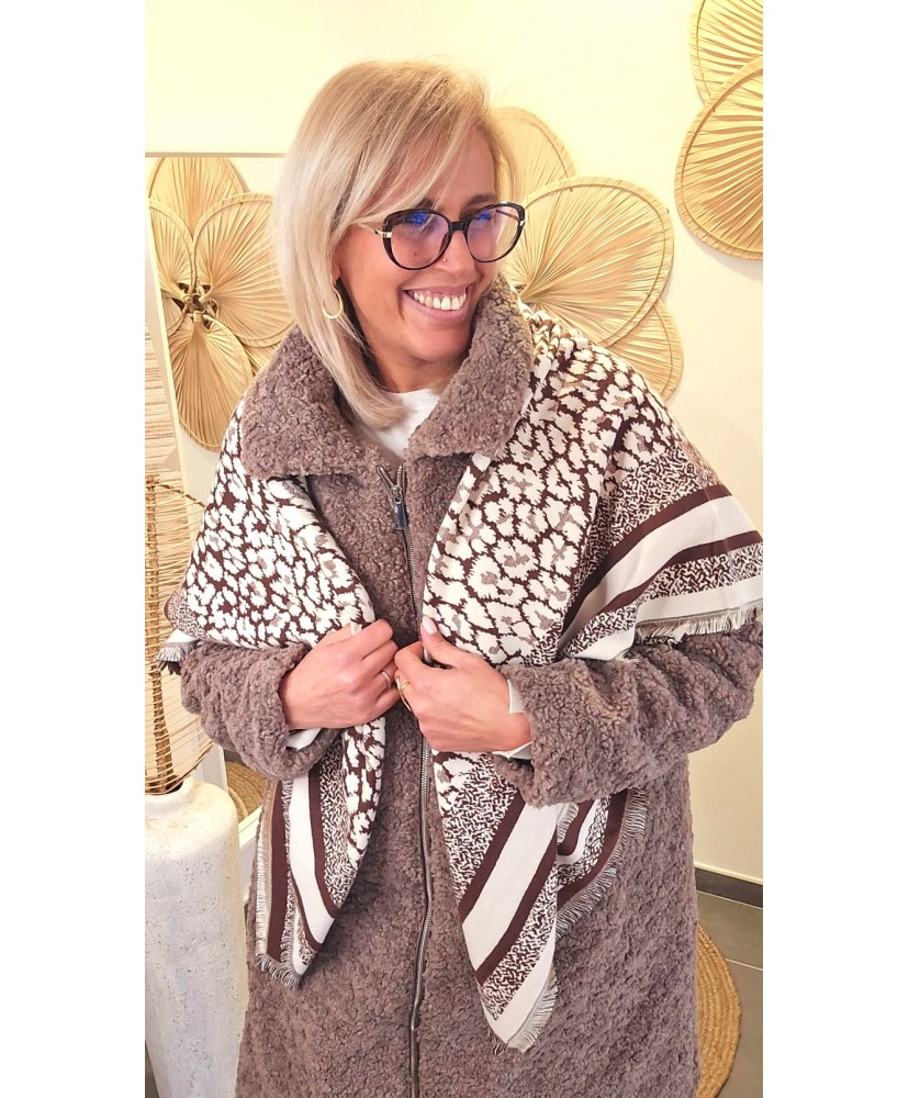 Ajoutez une touche de douceur et de raffinement à vos looks d’hiver avec cette superbe écharpe imprimée dans des tons chocolat claires chaleureux. Son motif délicat façon léopard revisité apporte une élégance subtile, idéale pour rehausser aussi bien une tenue casual qu’un look plus habillé.