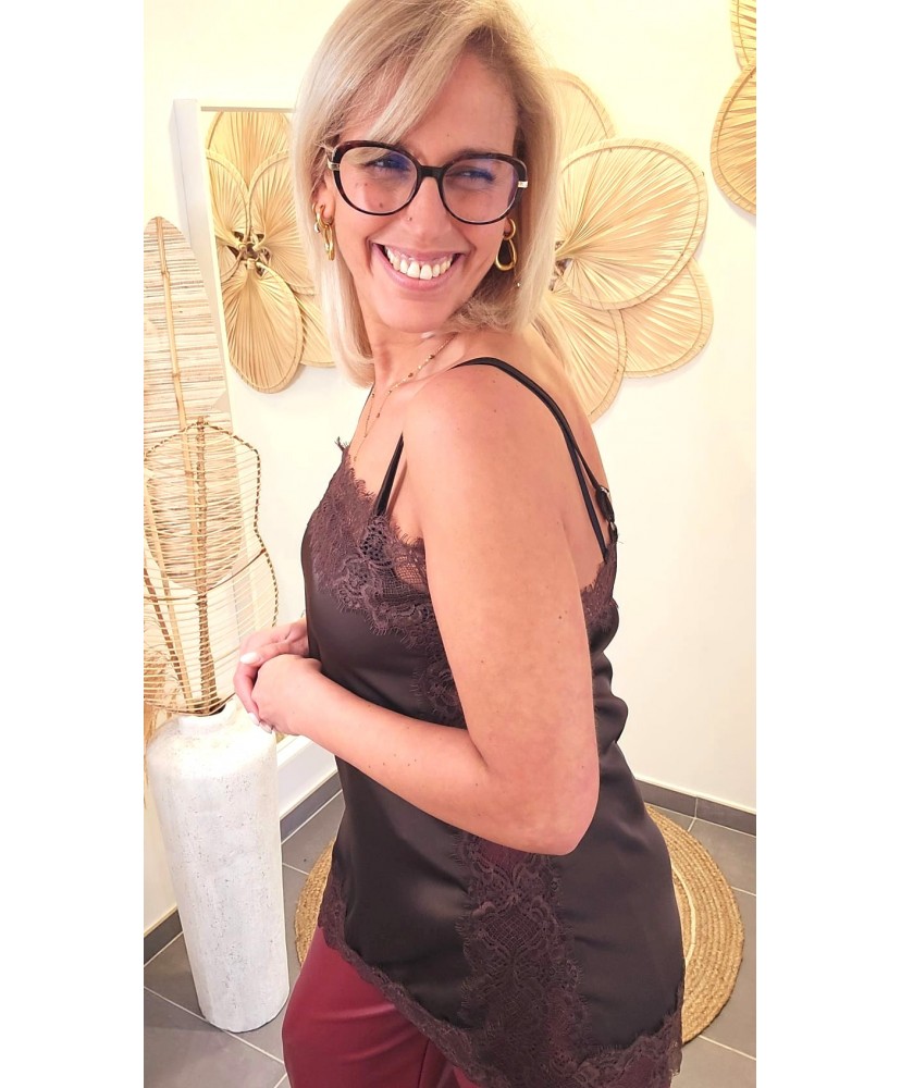Ce caraco chocolat est une pièce ultra-féminine, délicate et raffinée, parfaite pour sublimer vos tenues avec une touche de sensualité chic. Sa coupe fluide met en valeur la silhouette tandis que les finitions en dentelle travaillée, présentes sur le décolleté et sur les côtés, apportent un charme irrésistible.
