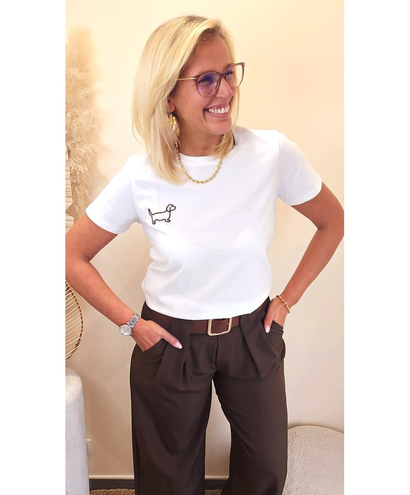 Un t-shirt blanc à l’élégance minimaliste, rehaussé d’une délicate broderie chien placée sur la poitrine 🐶