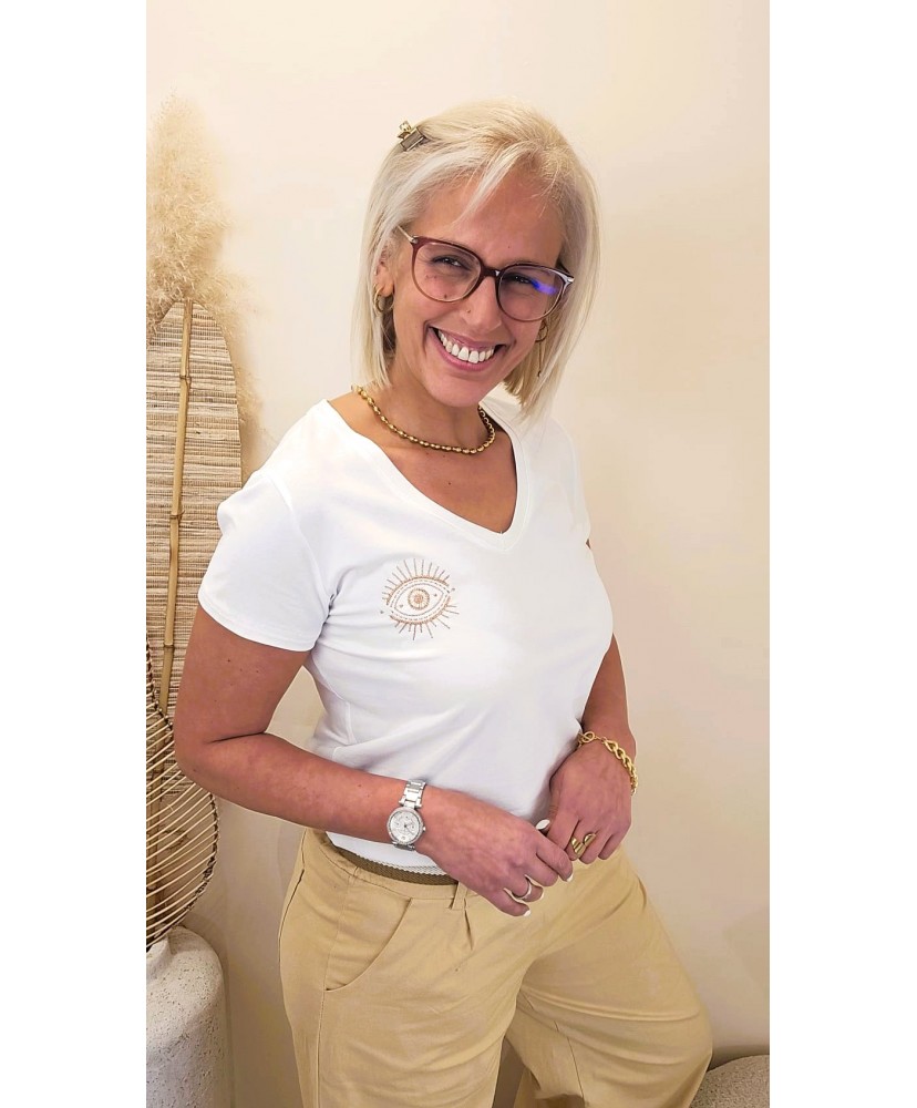 Le T-shirt Eye Spirit Blanc se distingue par sa coupe simple et efficace, sublimée par un motif œil doré délicat qui apporte une note tendance et symbolique.