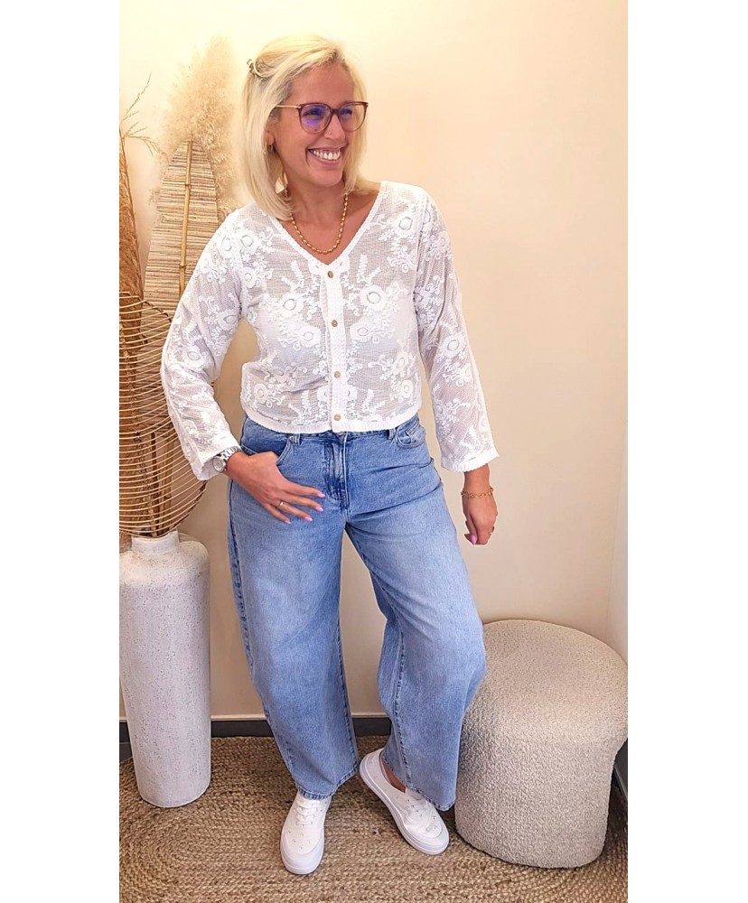 Sa coupe arrondie au niveau des jambes, légèrement ample sur les hanches puis resserrée vers la cheville, crée une silhouette contemporaine et très mode. Ce jean offre à la fois confort et allure, parfait pour celles qui veulent un denim différent du jean classique.