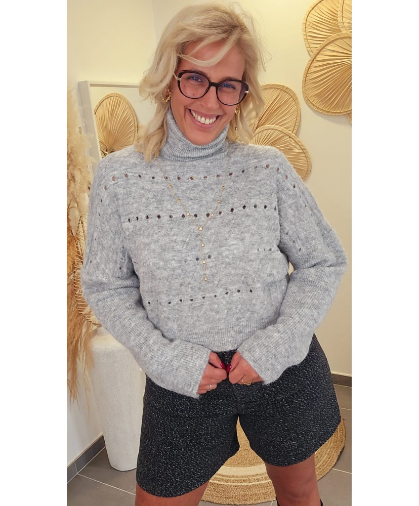 Craquez pour ce pull col roulé gris à la maille ajourée, parfait pour affronter la saison avec style et confort.