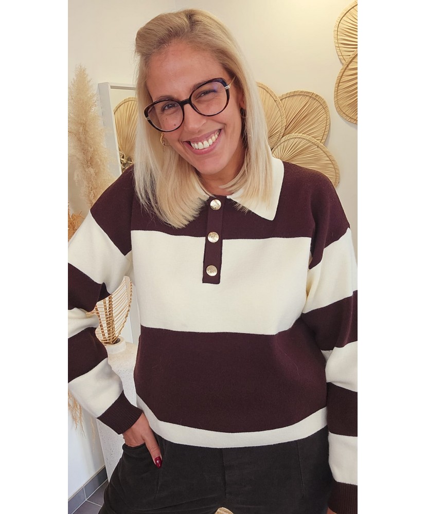 Craquez pour ce superbe polo à larges rayures, parfait mélange entre confort et élégance. Avec son col classique, ses trois boutons dorés et ses teintes chaudes de marron chocolat et d’écru, il apporte une touche raffinée à vos looks du quotidien.