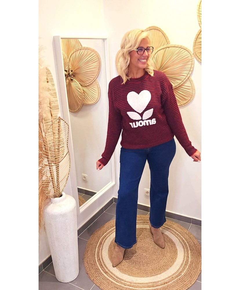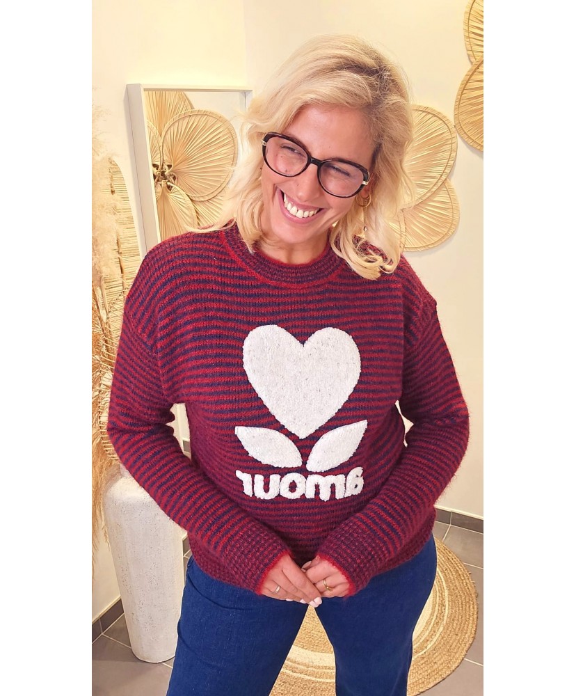 Ce pull à rayures marines et rouges apporte une touche de douceur et de bonne humeur à votre look. On adore son grand cœur texturé à l’avant qui donne tout le caractère à la pièce, ainsi que son inscription tendance effet bouclette.