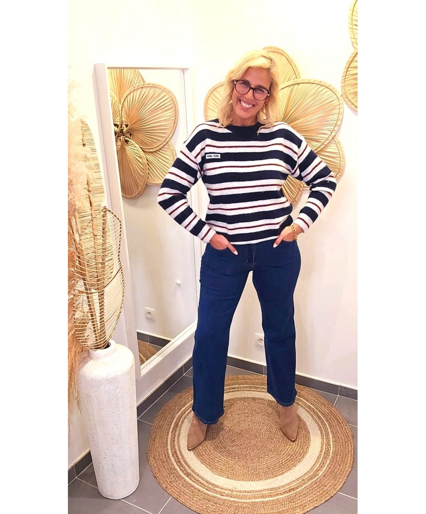 Craquez pour ce pull marinière revisité avec ses rayures bleu marine, blanc et une touche de rouge brique ✨