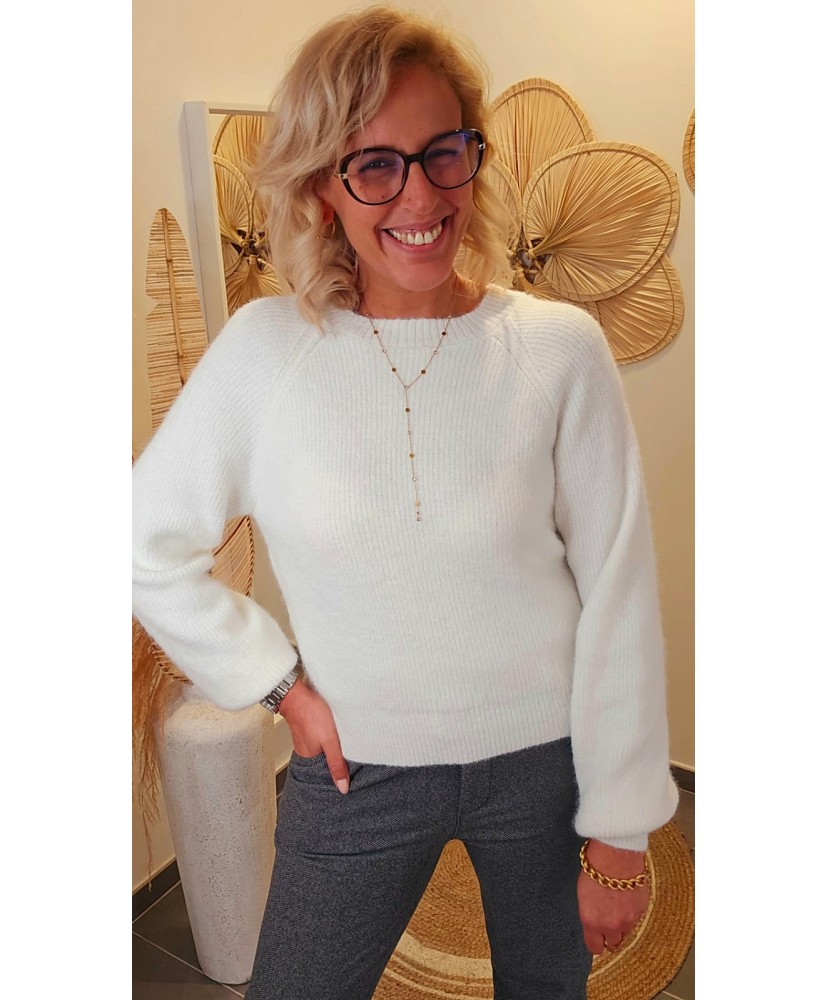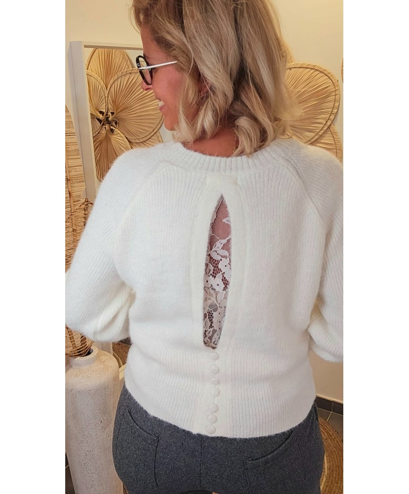 Ce pull écru séduit par sa maille douce et lumineuse, idéale pour la saison hivernale. À l’avant, un style épuré et intemporel ; à l’arrière, une superbe ouverture délicatement travaillée, sublimée par une bande de dentelle féminine et une patte de petits boutons, pour un effet chic et inattendu.