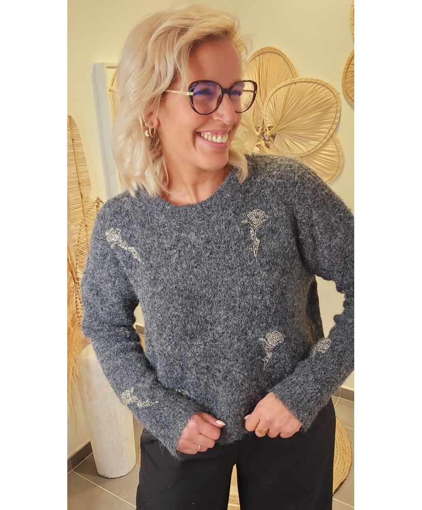 Confectionné dans une maille duveteuse ultra-agréable à porter, il apporte immédiatement une touche cocooning à votre look, tout en restant élégant grâce à ses motifs strass délicatement appliqués