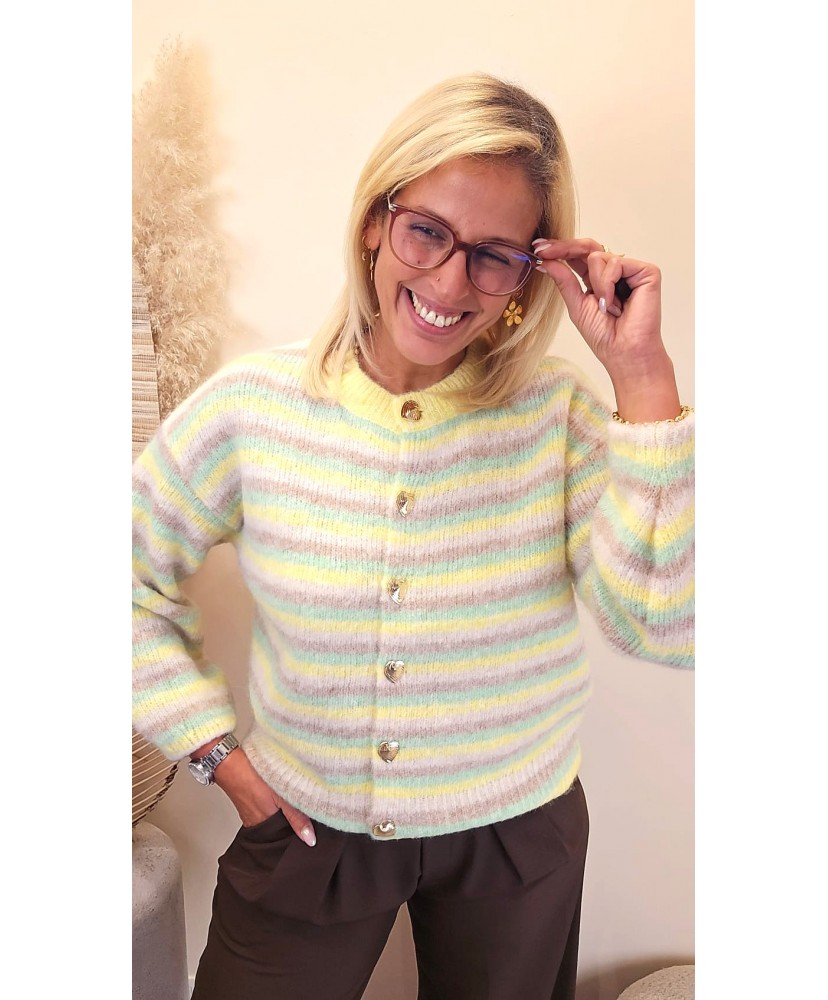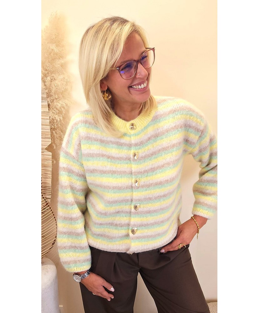 Ses rayures pastel délicates apportent une touche lumineuse et féminine, faciles à associer avec un jean, un pantalon fluide ou une jupe. La coupe est souple et agréable, idéale pour un look à la fois cosy et stylé.