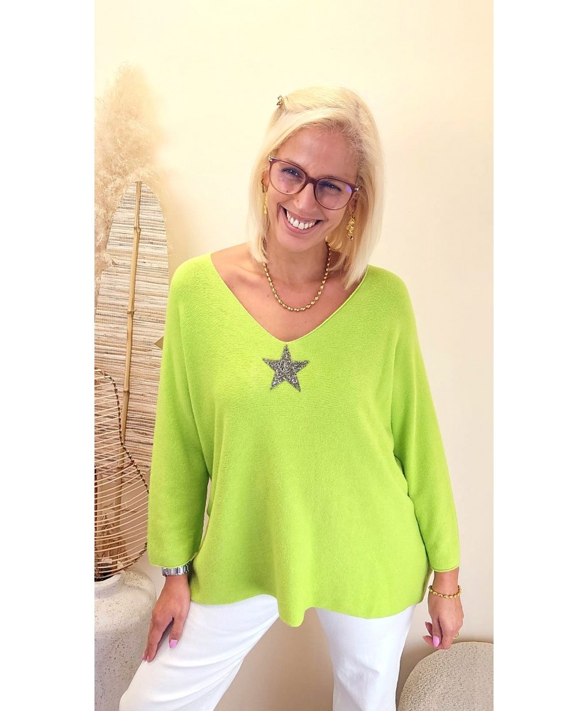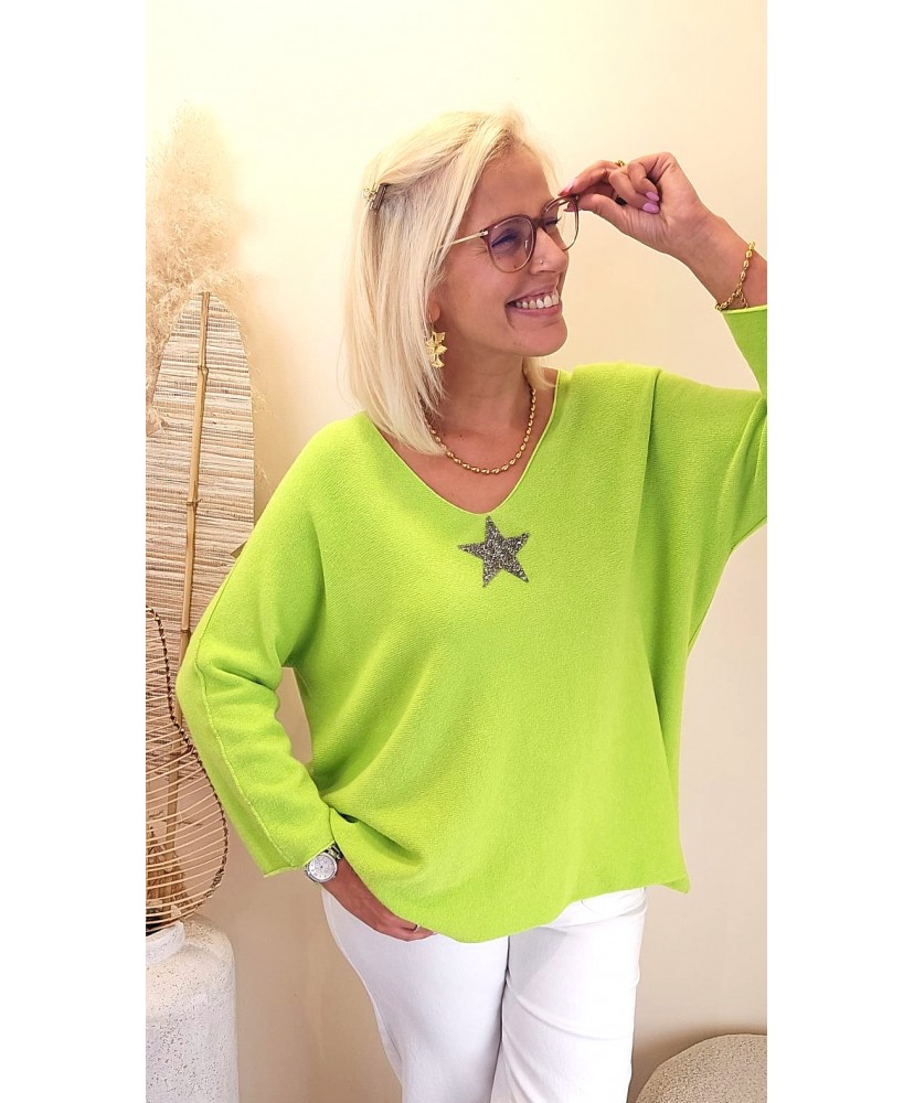 Doux, lumineux et résolument féminin, séduit par sa teinte vert anis délicate qui apporte fraîcheur et élégance à la silhouette. Sa maille fine et agréable à porter offre un tombé fluide et confortable, parfait pour un look chic et effortless.
