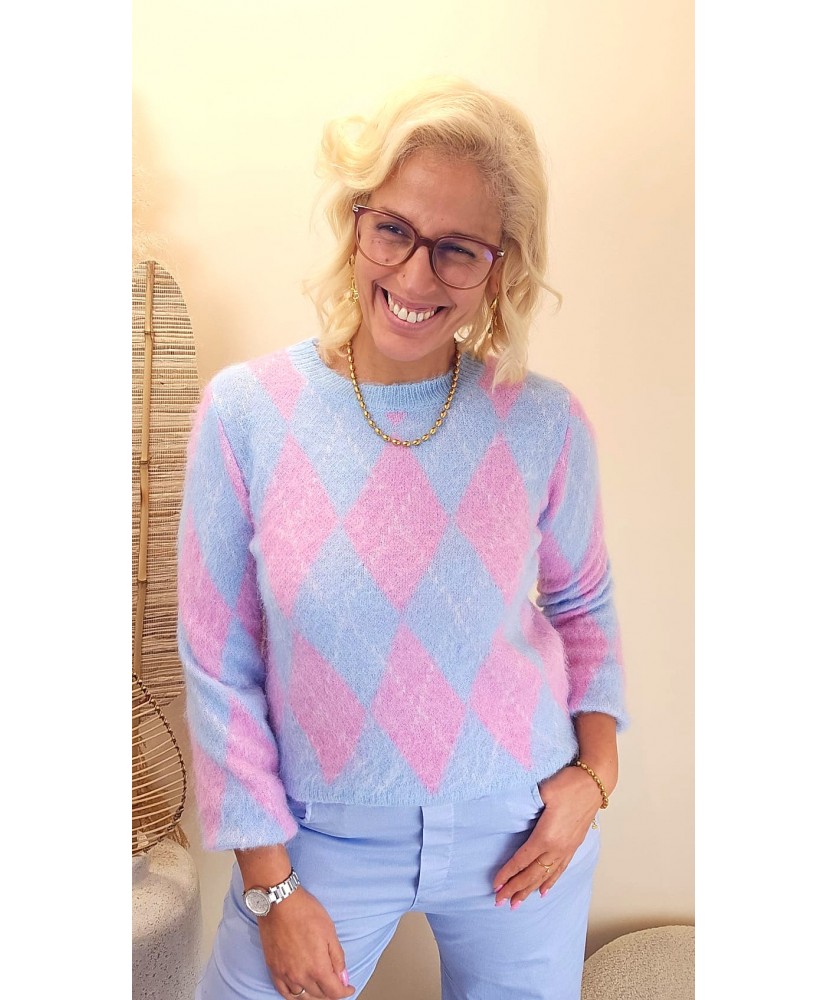 Craquez pour la douceur irrésistible du Pull Sweet Diamond, une pièce cocooning aussi confortable que tendance. Son motif losanges aux teintes pastel, mêlant bleu ciel et rose poudré, apporte fraîcheur, féminité et modernité au look.
