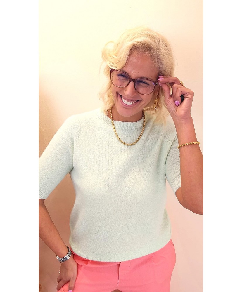 Sa teinte subtile, lumineuse et apaisante, apporte une touche chic et raffinée à la silhouette. Avec son col rond, ses manches courtes et sa coupe droite, il se porte facilement seul ou sous une veste pour un look soigné et moderne.