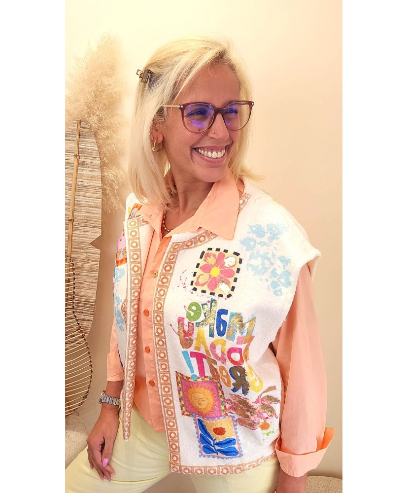 Apportez une véritable dose de bonne humeur et de couleur à votre tenue avec ce gilet sans manches au style unique et artistique.