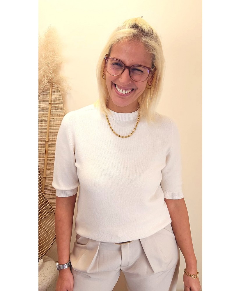 Ce pull élégant à manches courtes est une pièce intemporelle qui allie simplicité, douceur et raffinement.