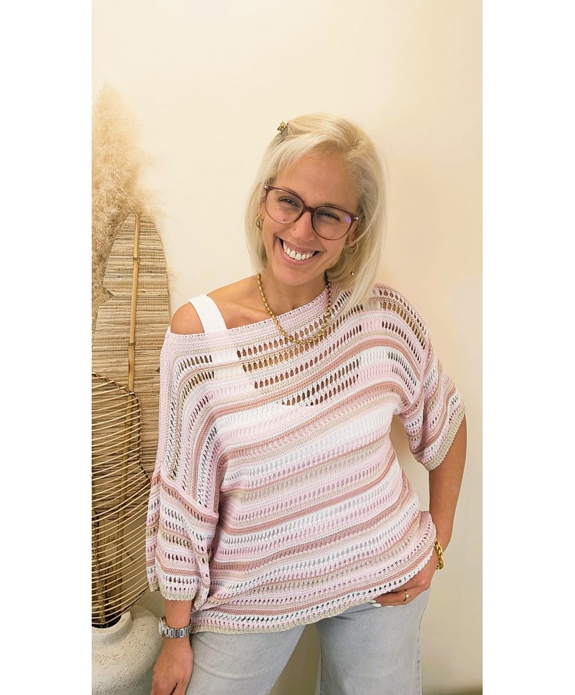 Le Pull ajouré Soft Breeze séduit par sa maille ajourée et ses nuances douces mêlant rose, blanc et beige pour un rendu délicat et lumineux.