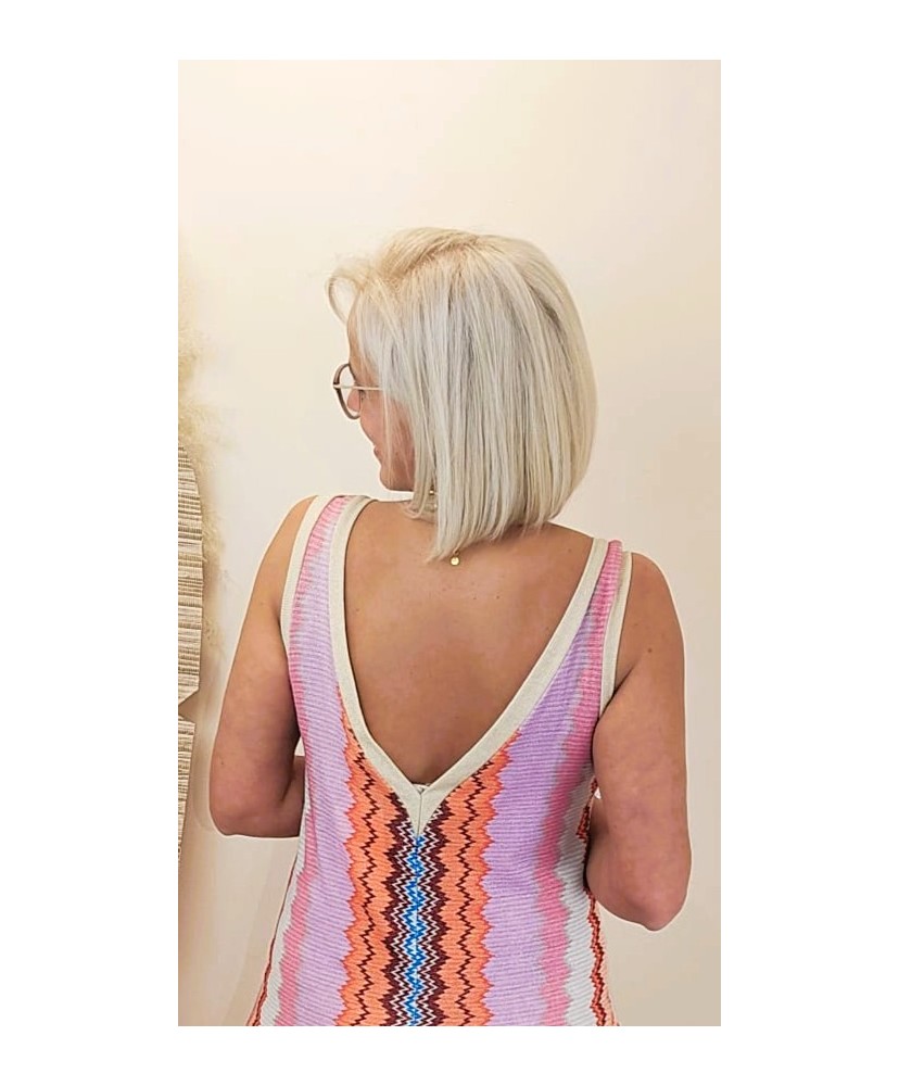 La robe Sunset Riviera séduit par ses rayures multicolores sublimées par de délicats fils lurex qui captent la lumière à chaque mouvement.