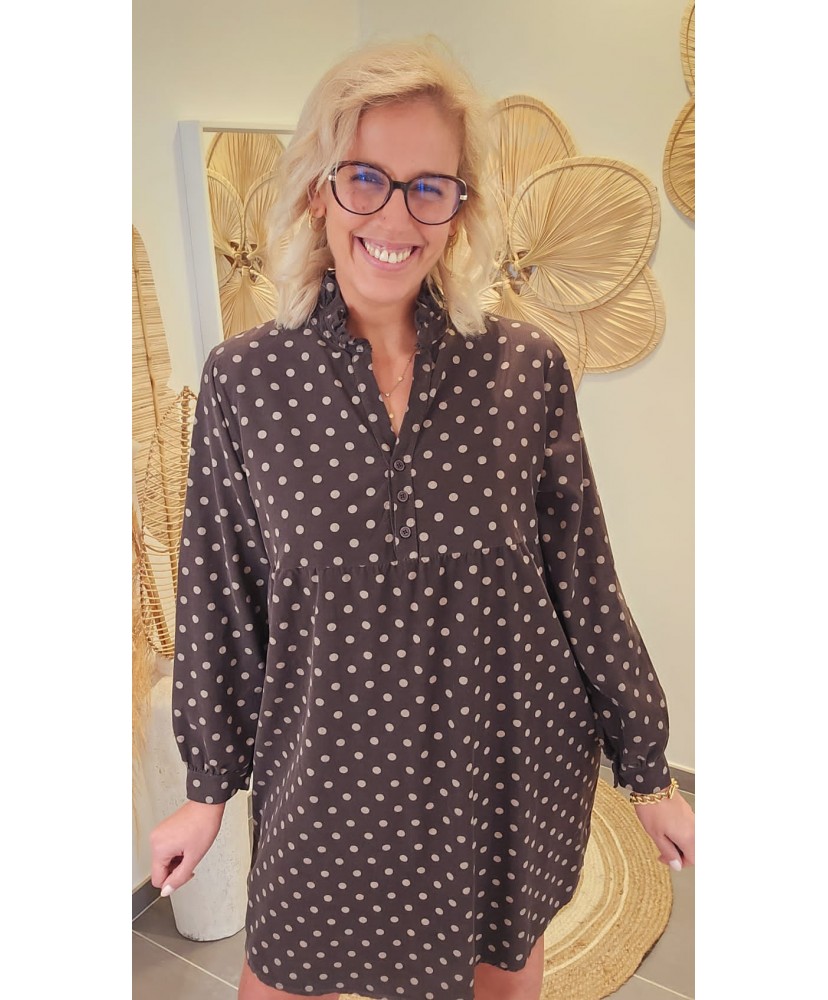 Cette robe coloris chocolat à pois chocolat séduit par son esprit doux et élégant. Son imprimé délicat apporte du caractère tout en restant facile à porter au quotidien, pour un look chic sans effort.