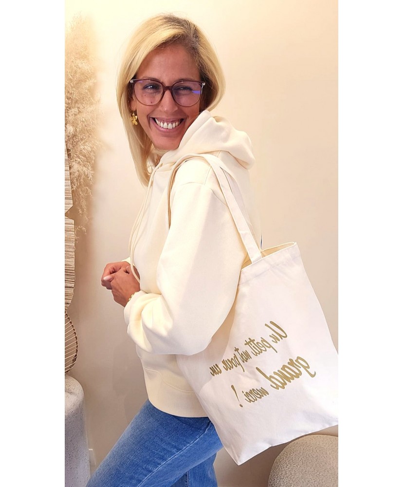 Le cabas Une Petite Note de Joie est bien plus qu’un simple sac : c’est un message positif à emporter partout avec soi.